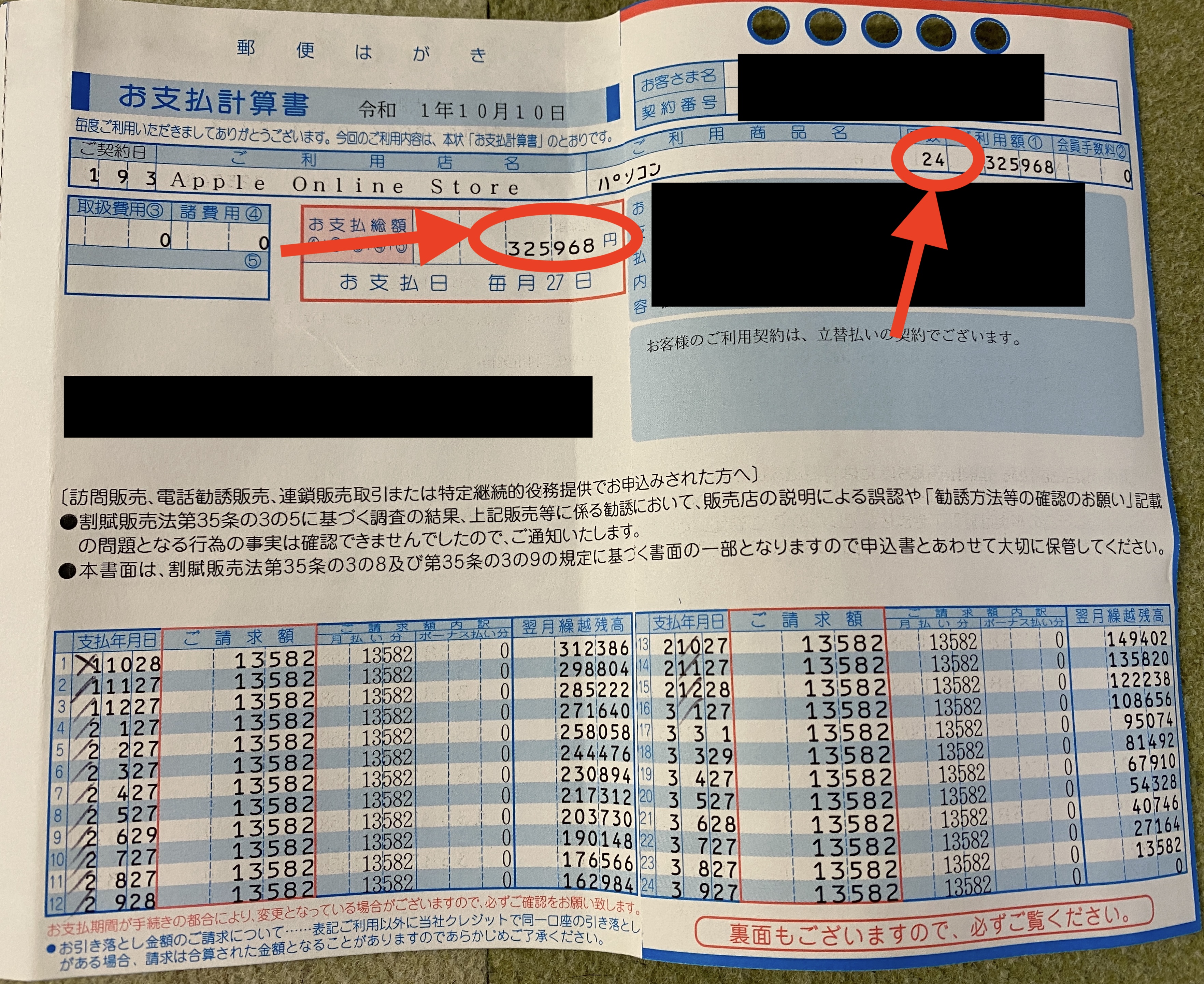 (一ヶ月に支払う金額が¥13,582円。それを24回支払うので、「13,582×24=¥325,968円」。つまり、支払うトータル金額は変わりません)