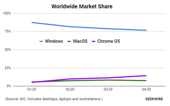 こちらの調査によると、すでにMacOSよりも、ChromeOSを使っている人の方が多いのです。▼