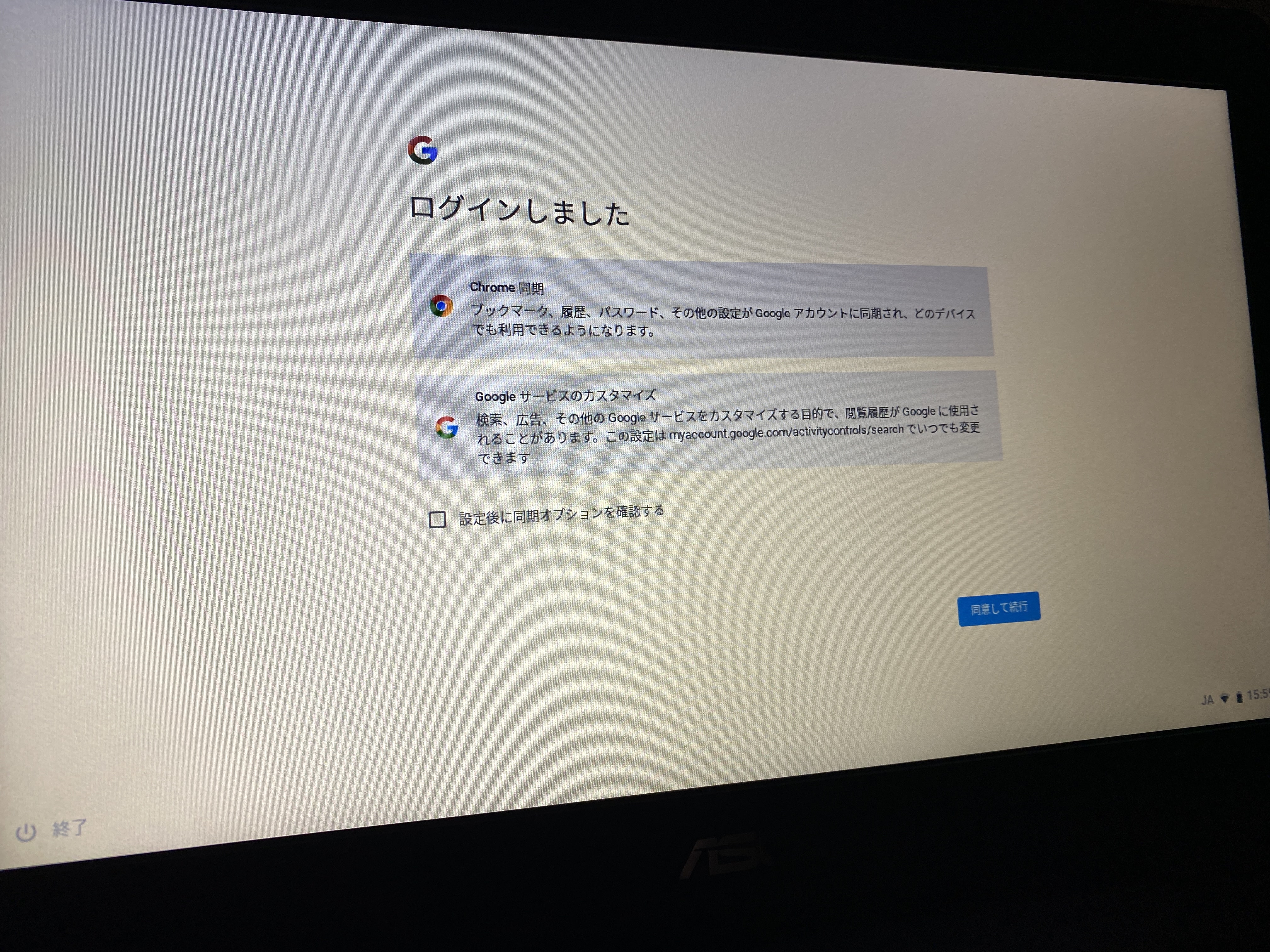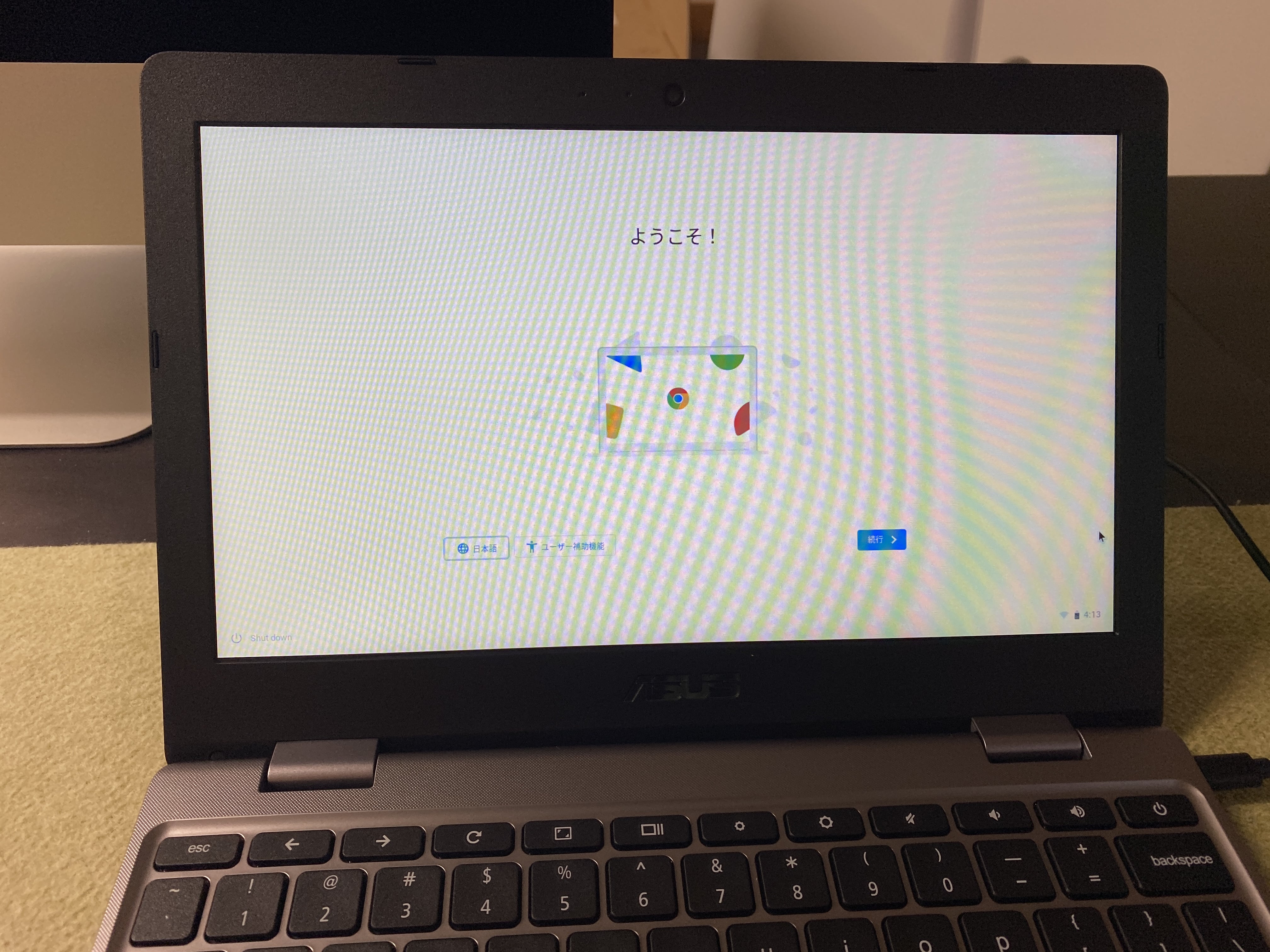 クロームブックはGoogleのOSが入っているので、まずはGoogleのアカウントへのログインを求められます。▼