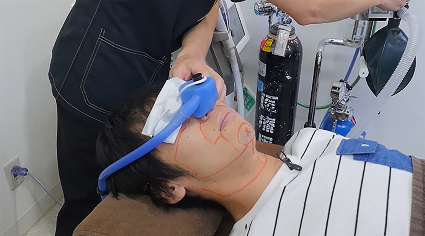 まずは、いつも通りベッドに横になったあと、笑気麻酔を吸い込みます。▼