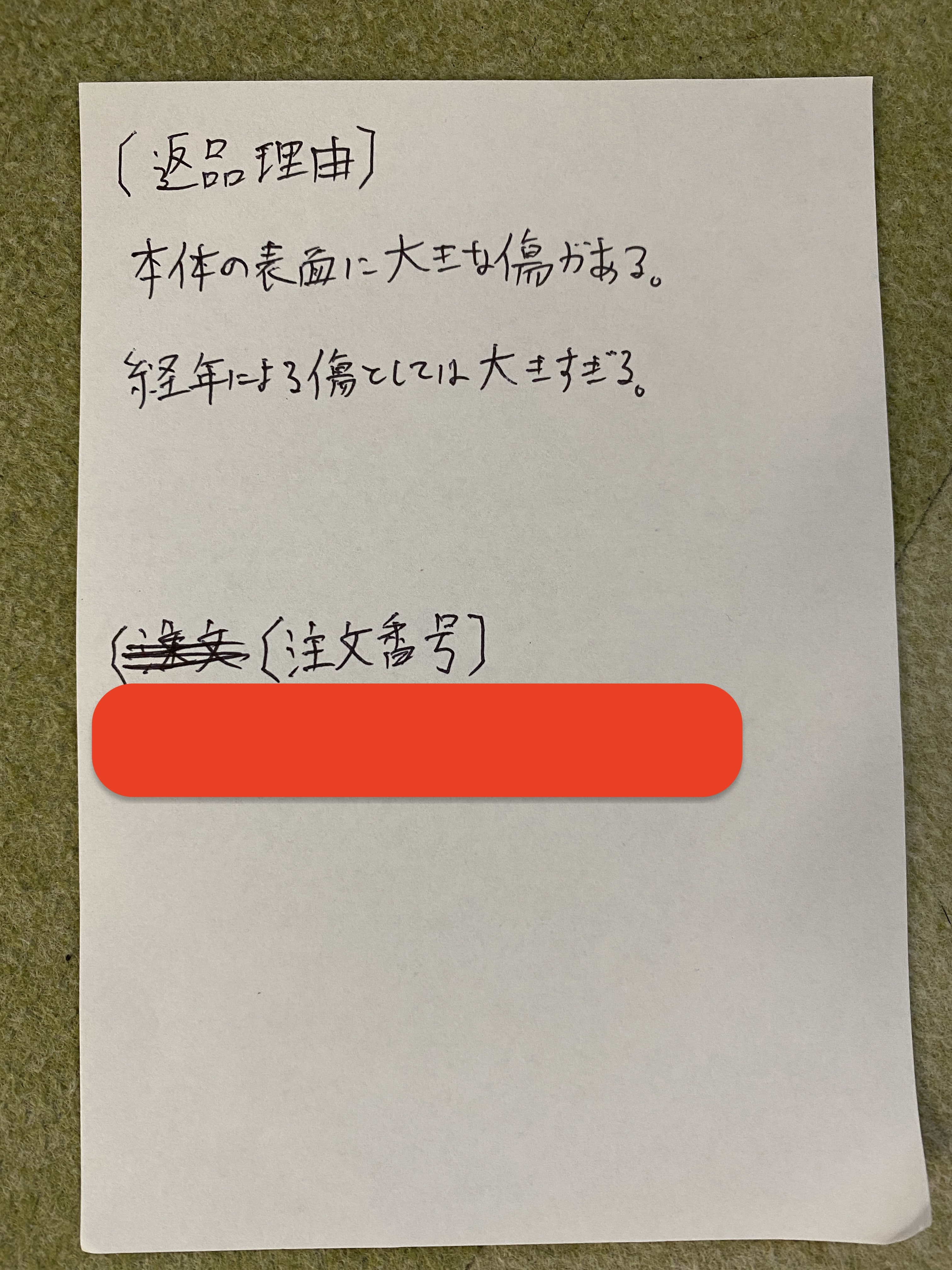 返送の際には 、メモに返品理由と注文番号を記載してご返送いただくようお願い致します。