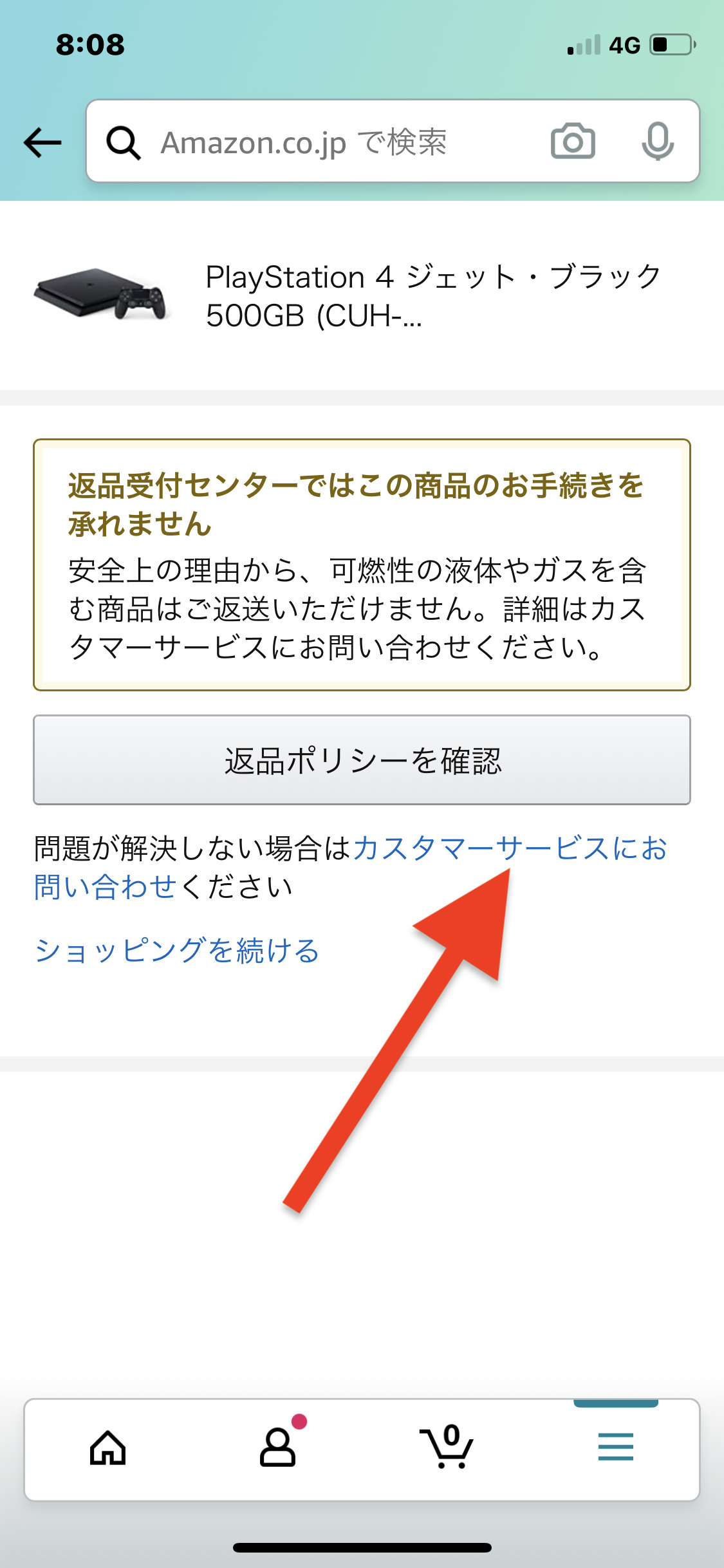 今回は、アマゾンマーケットプレイスで購入したので、「返品受付センターではこの商品のお手続きを承れません」という表示が出ます。▼