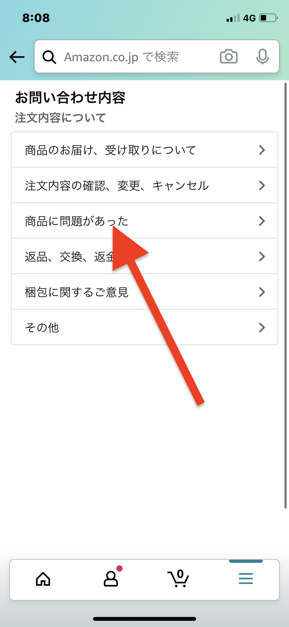 「商品に問題があった」をクリック