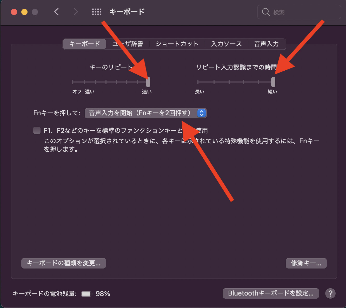 これをすると、Fnキーを2回押すだけで音声入力が起動します。