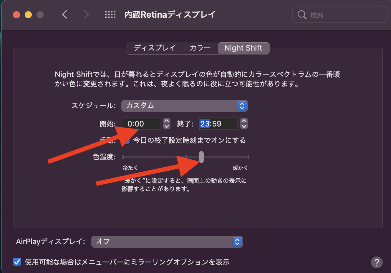 開始を0:00・終了を23:59にしておけば、一日中「Night Shift」がONになるので、目を大事にしたい人はやってみてください。