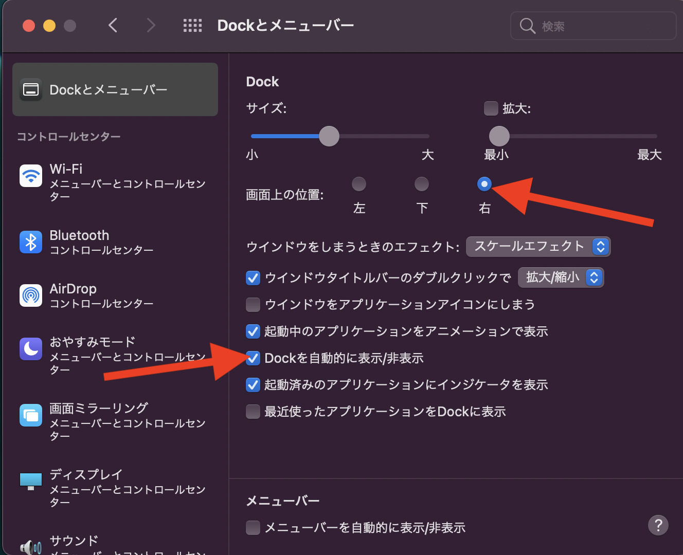 さらに、Dockを自動的に表示/非表示をONにしておくと、カーソルを合わせた時にしかDockが表示されなくなるので、見た目がスッキリするのでおすすめです。