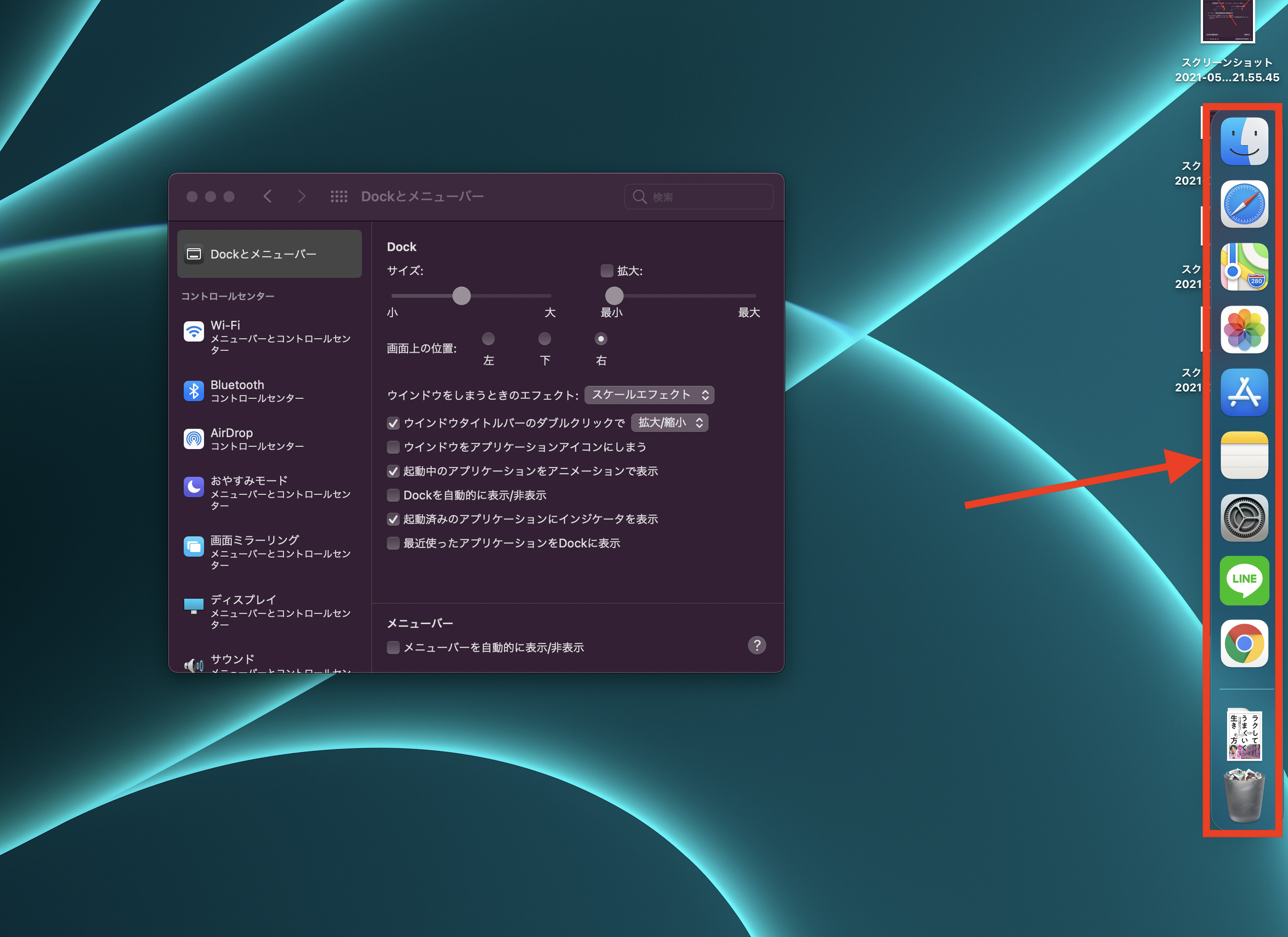 デフォルトだと、Dockの位置が下にあるのですが、個人的にこれはじゃまで見にくい。