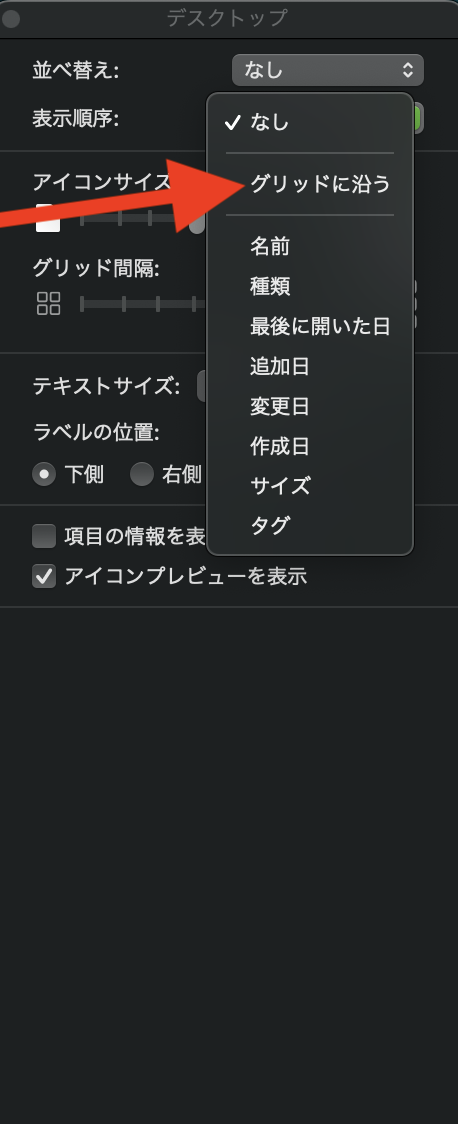 これを直すには、デスクトップで右クリックして「グリッドに沿う」をえらびましょう。▼