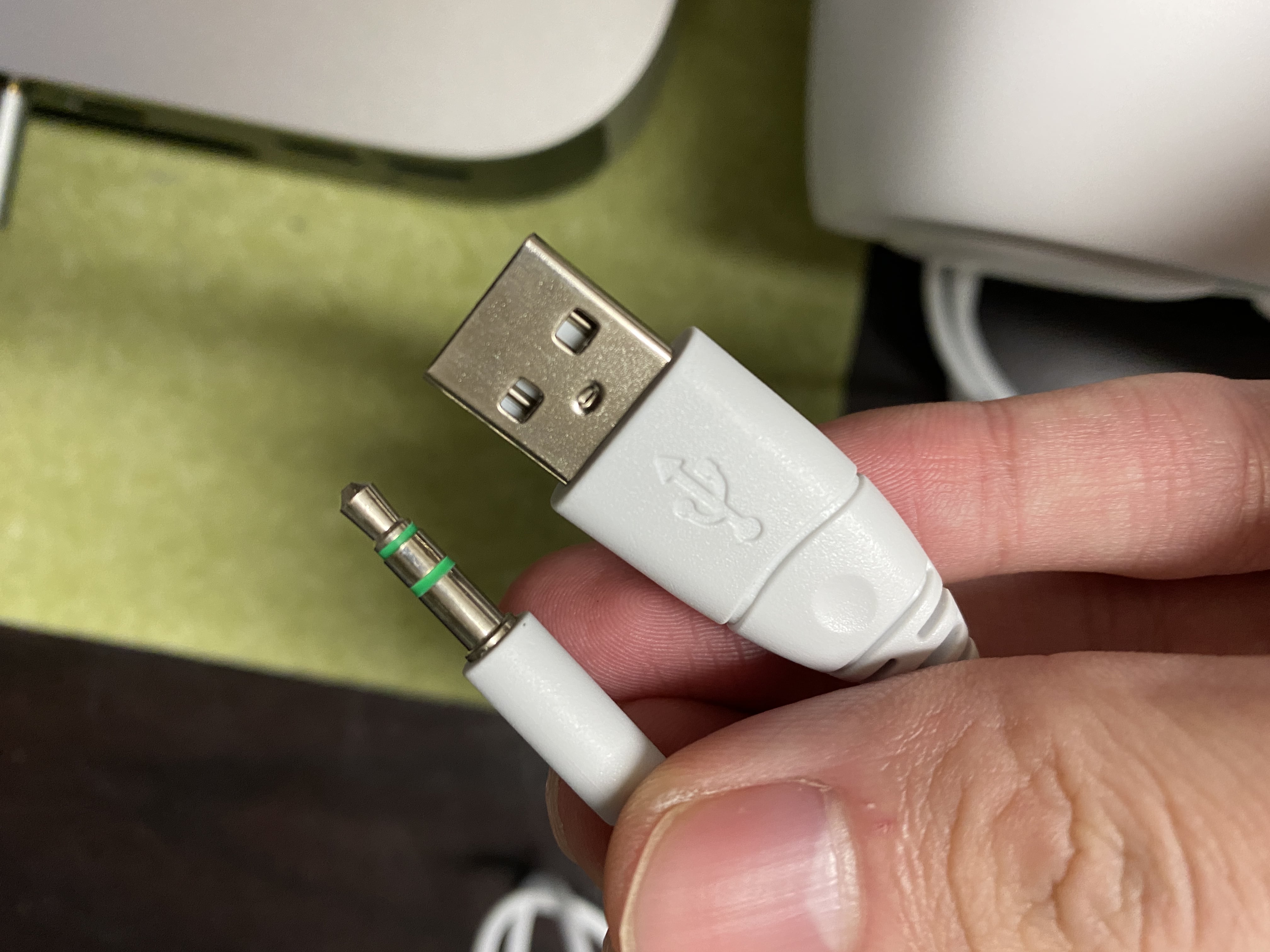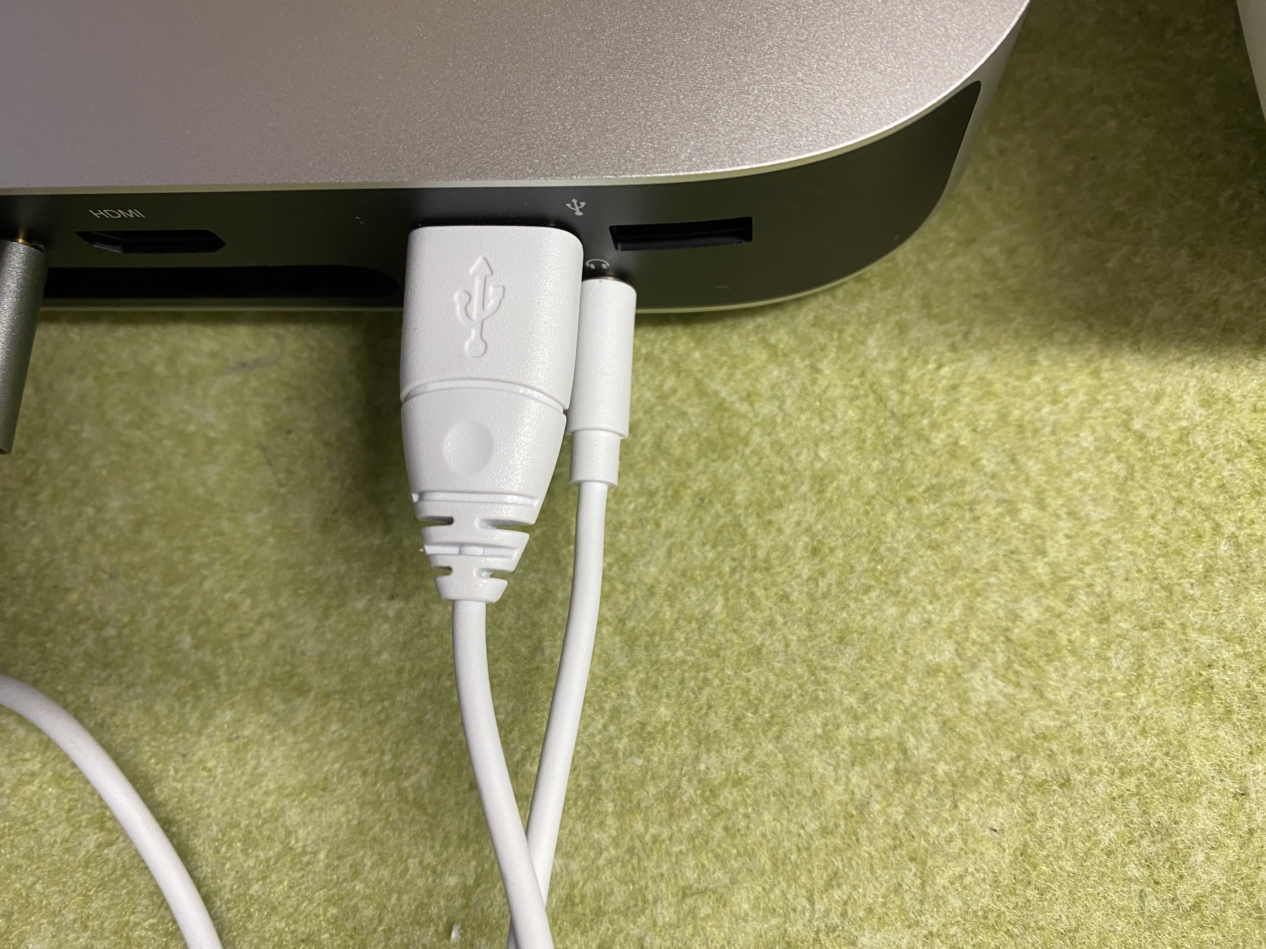 イヤホンをMac miniの本体のイヤホンジャックに、もう一方をMac miniのUSB-typeAにさせばOKです。