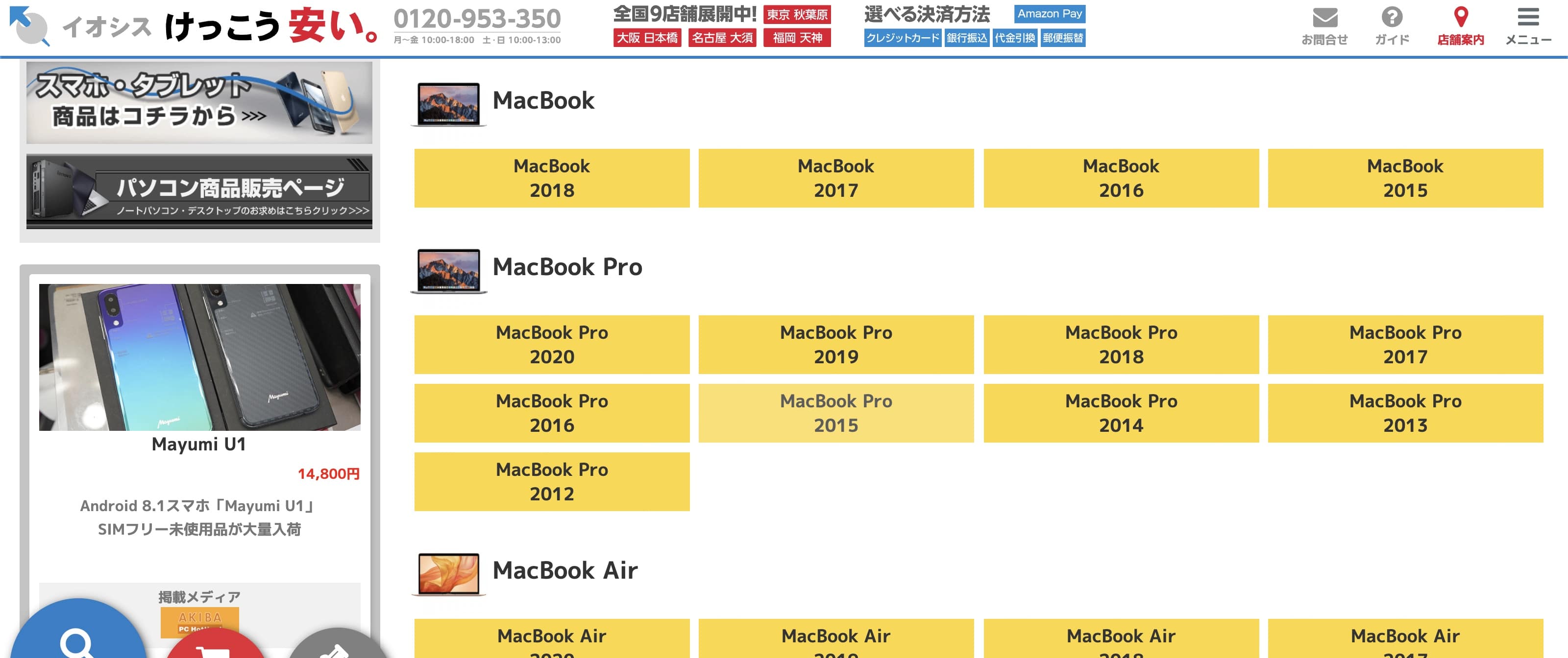 歴代のMacBookの中古品がすごく見やすく並んでいるので、おすすめです。(ぶっちゃけApple公式サイトより見やすい……)