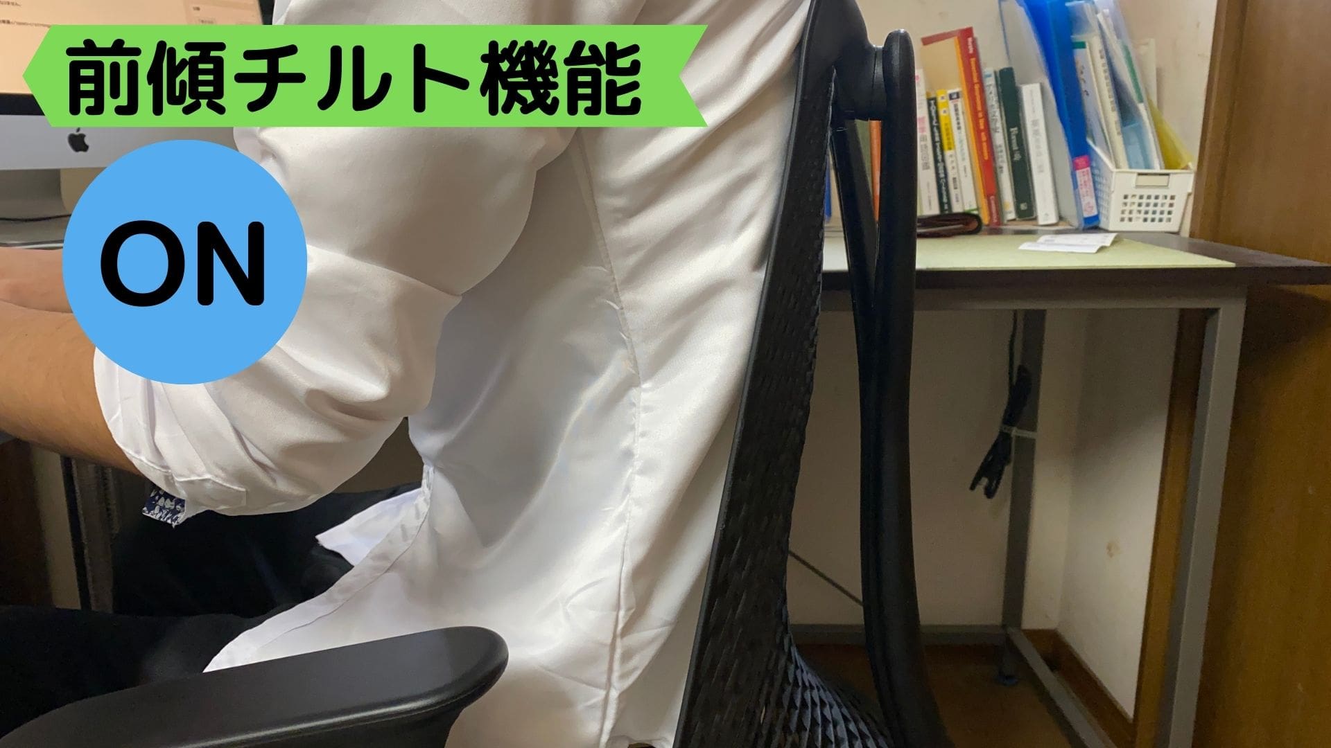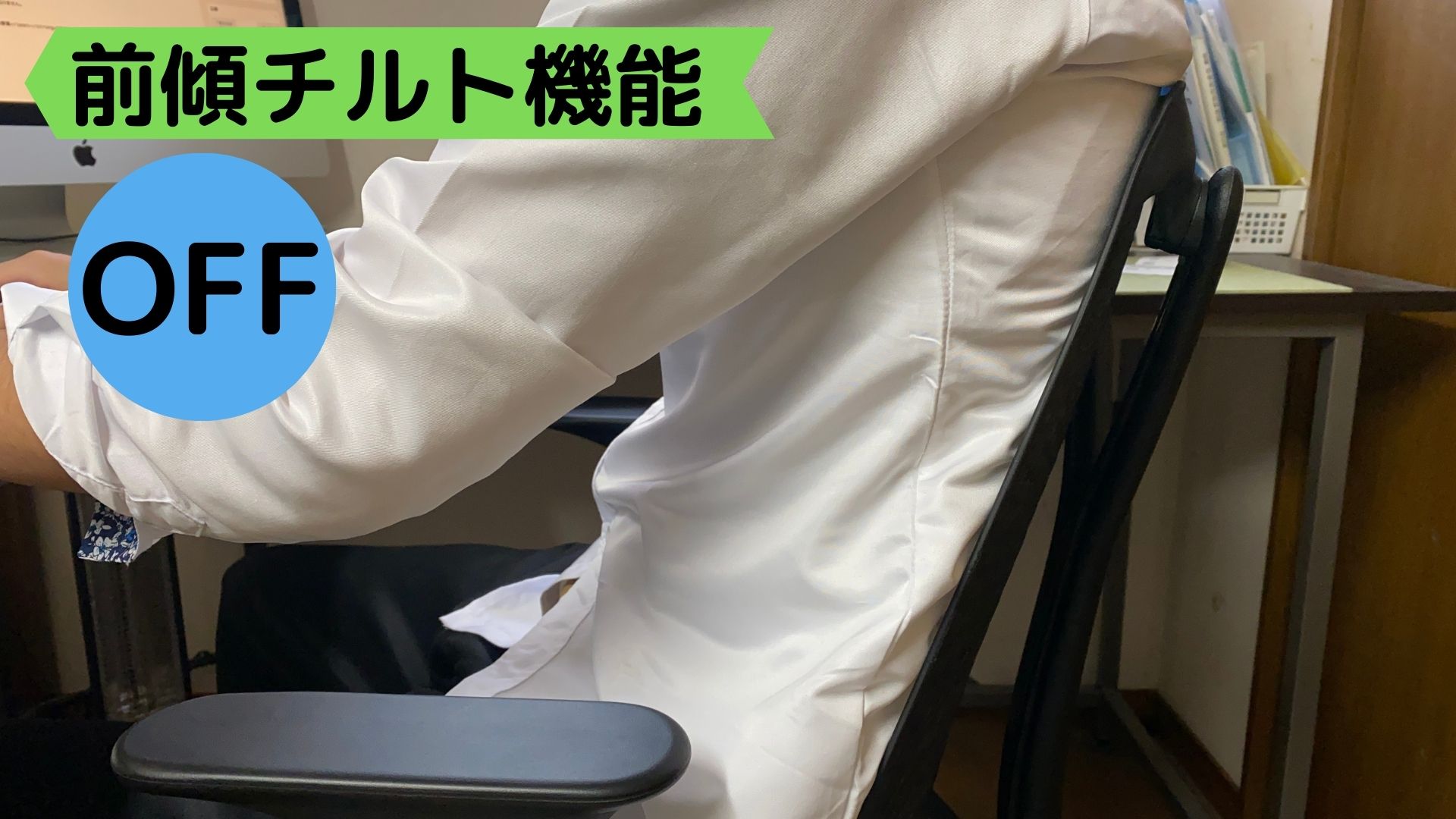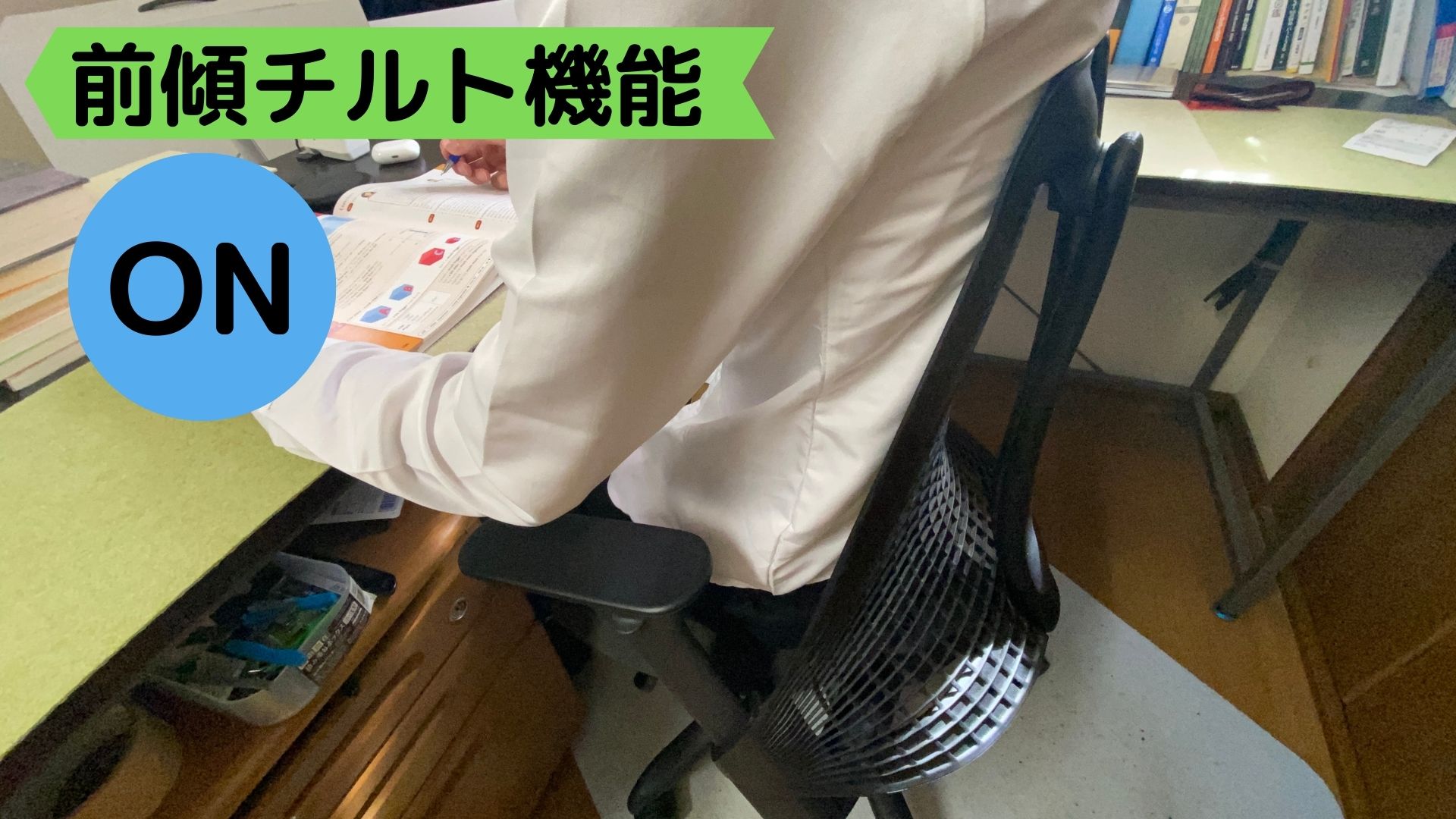 パソコン作業だと、別に前傾チルト機能を使わなくてもいいんですが、集中力が切れてきた時に前傾チルト機能をONにするとメリハリがつくので、集中力が持続しますよ。